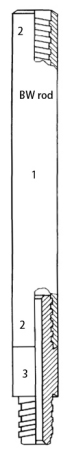| BW drill rod configuration: 1-BW drill rod overview 2-BW drill rod body with box thread 3-BW drill rod coupling with pin thread